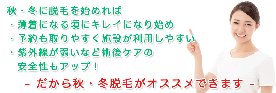 お薬の処方と照射後の注意点などのご説明で十分な安全の確保をしてはいますが、秋服・冬服の厚着であれば施術部位が紫外線から守られたり、紫外線自体が少ない季節に行うことで、より安全性の高い脱毛ケアが行えます。