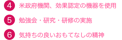 日本人の毛質にあった脱毛処理が可能で当院以外でも脱毛用途で医療機関に導入されている機器としてはトップレベルのシェアがあり、その他にも脱毛レーザーの2大シェアのもう一つと言われるダイオードレーザーの導入経験なども経たうえでアレキサンドライトレーザーがより患者様に「満足していただける仕上り」を効果的に行えると判断し採用していますので、あなたを始めとした皆様に合った専門的な脱毛処置を行ってまいります。